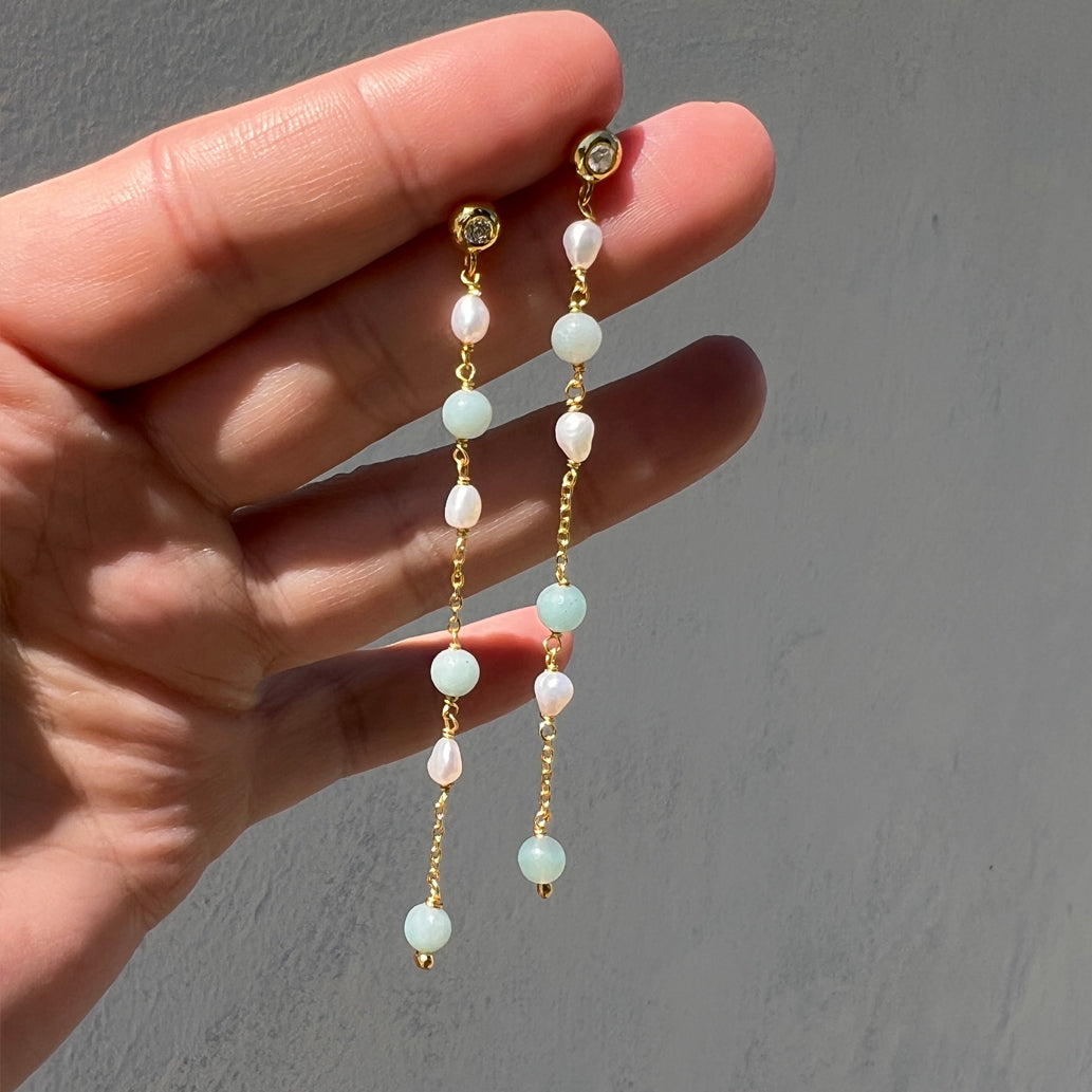 Allure Kettenohrringe aus 18 Karat vergoldetem Silber mit Amazonit, Süßwasserperle und zirkonia.